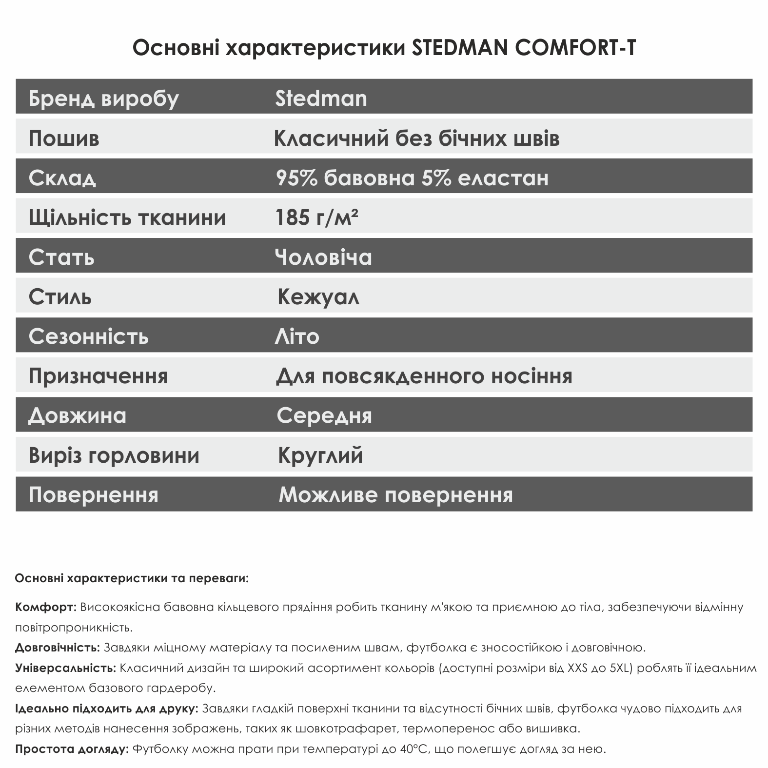 Відповідь: Так, Stedman Classic-T — одна з найкращих моделей для друку. Завдяки високій щільності плетіння та відсутності бічних швів, зображення лягає рівно і тримається довго (підходить для шовкографії, термотрансферу та прямого цифрового друку).